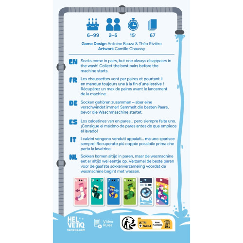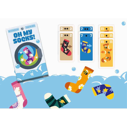 Un jeu de société rigolo pour petits et grands ! Dans ce jeu de société familial, les joueurs posent leurs cartes devant eux pour former des paires de chaussettes de même couleur. Lorsque la carte machine à laver est tirée, les tas qui ne marchent pas par paires sont éliminés et on compte les autres chaussettes. Les enfants adorent ! Un peu de stratégie, juste ce qu'il faut pour commencer dès 5 ans.